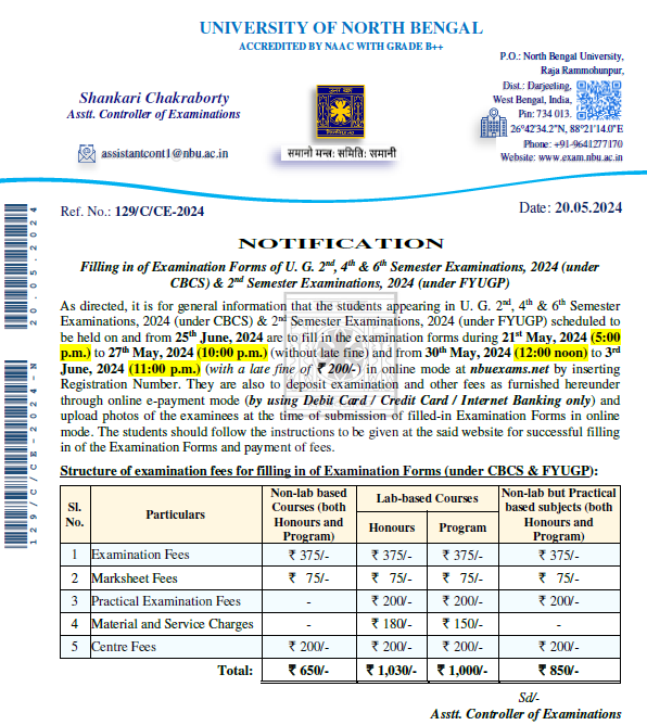 Filling in of Examination Forms of U. G. 2nd, 4th & 6th Semester Examinations, 2024