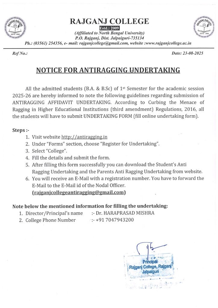 NOTICE FOR ANTIRAGGING UNDERTAKING 2025-26
