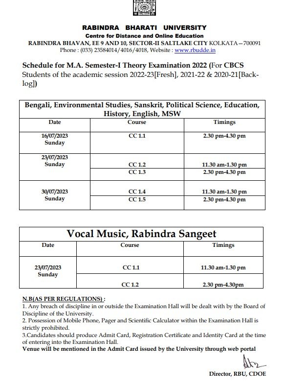 Schedule for M.A. Semester-I Theory Examination 2022 (For CBCS Students of the academic session 2022-23[Fresh], 2021-22 & 2020-21[Back- log])