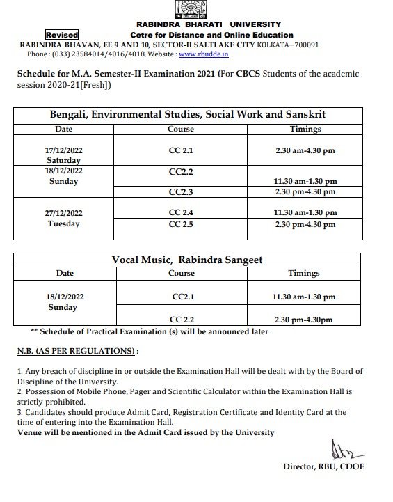 Schedule for M.A. Semester-II Examination 2021 (For CBCS Students of the academic session 2020-21[Fresh])